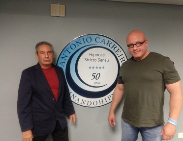 O hipnoterapeuta e professor Emílio Amorim (à direita) com o professor e doutor Antônio Carreiro no curso Hipnose Stricto Senso, realizado em São Paulo...